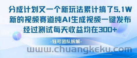 分成计划又一个新玩法累计搞了5W 新的视频赛道纯AI生成视频一键发布经过测试每天收益均在300+