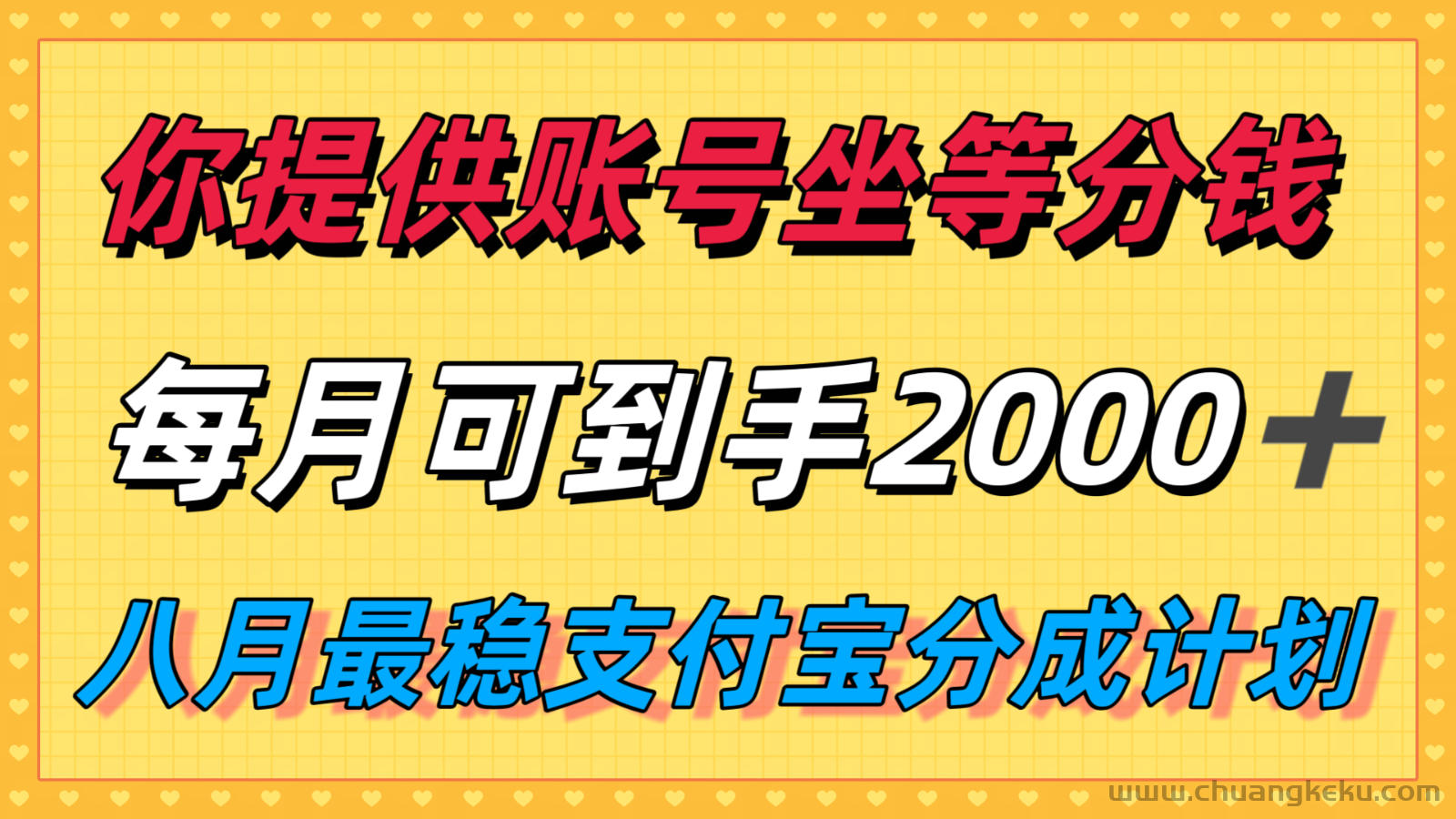 创客库 » 你提供账号我们发视频,每月到手2k+,八月最稳支付宝分成计划玩法来袭!