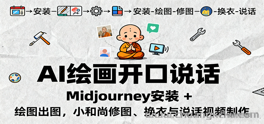 《AI绘图照片开口说话视频制作》=“AI绘图+角色精修+口播动画”三步速成:9节课手把手教你用Midjourney等主流工具生成小和尚角色,一键换衣换景并制作开口说话数字人视频,0基础7天产出100条原创短片,单条播放破10万,接星图/中视频计划月增收3000-10000元,可矩阵放大。