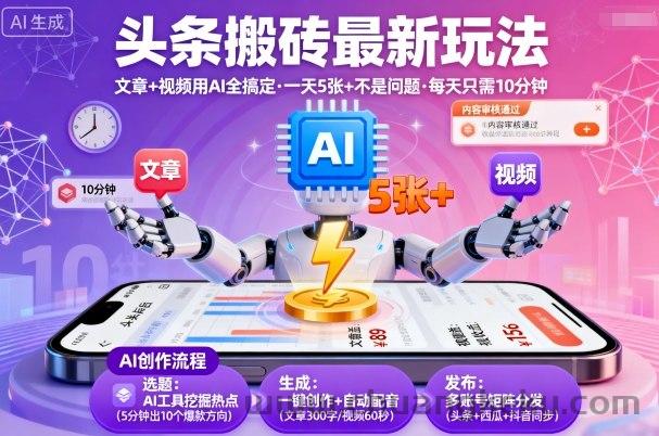 创客库 » 头条搬砖最新玩法,文章+视频用AI全搞定,一天5张+不是问题,每天只需10分钟