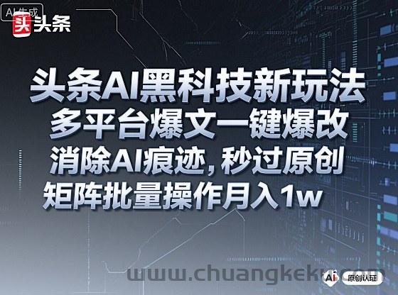 创客库 » 头条AI黑科技新玩法,多平台爆文一键爆改,消除AI痕迹,秒过原创,矩阵批量操作月入1w+【揭秘】