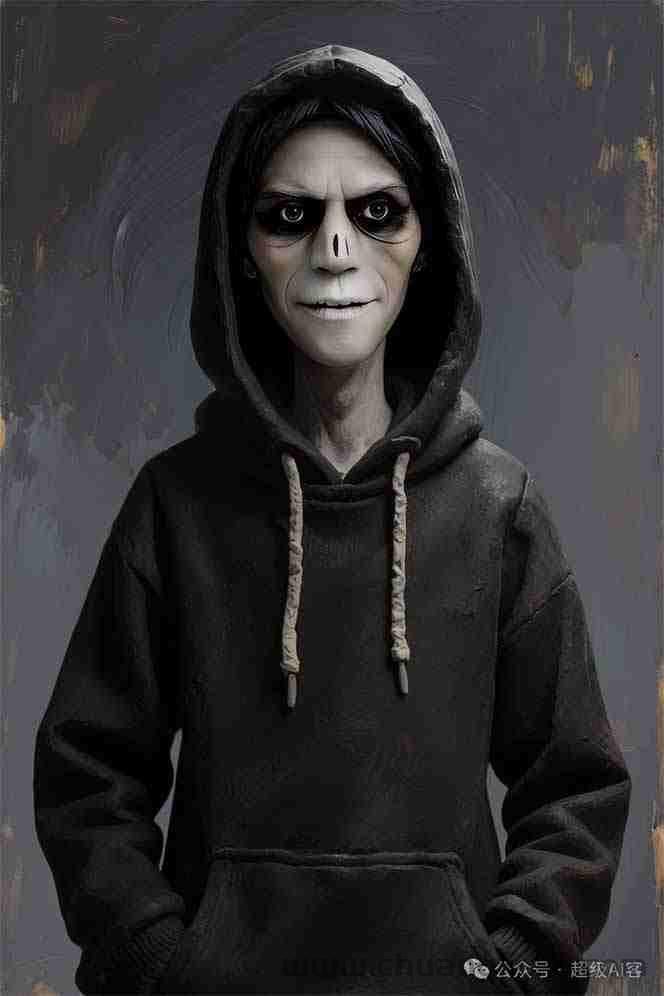 ***男子正对镜头,他的皮肤,是用厚涂技法(impasto)的油彩渲染出的病态惨灰白色,这个男子穿着一件黑色连帽衫)。强烈的明暗对照效果(Chiaroscuro)将他孤独的身影置于画面的视觉中心。