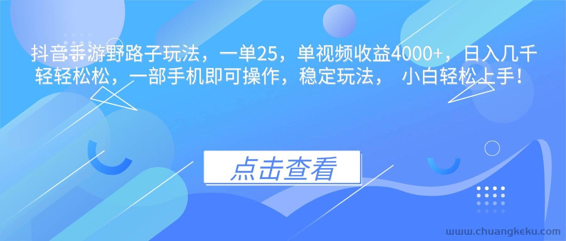 抖音手游野路子玩法,一单25,单视频收益4000+,日入几千轻轻松松,一部手机即可