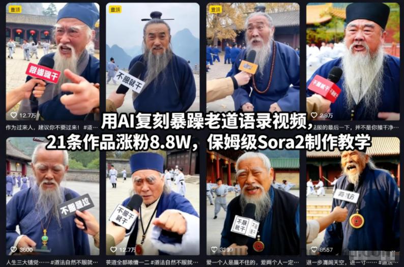 用AI复刻暴躁老道语录视频,21条作品涨粉8.8W,保姆级Sora2制作教学