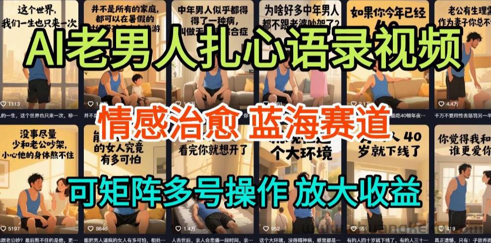情感治愈赛道,蓝海赛道,通过AI制作老男人扎心语一天制作几十条,成品发布抖音,小红书,视频号头条等等平台,可以矩阵多号放大收益,操作非常简单,用ai五分钟就能制一条视频,外面收费3980项目