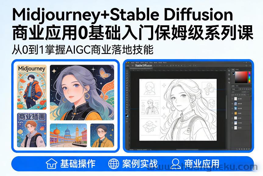 这款AIGC商业应用Midjourney+Stable Diffusion保姆级系列课,专为0基础小白、职场提升者、副业探索者量身打造,彻底摒弃“重理论、轻实操”的模式,全程保姆级教学,从工具入门到商业落地,逐步骤拆解、手把手带练,不用绘画基础、不用专业电脑,哪怕是纯小白,也能熟练掌握两大AI绘画工具,解锁多场景商业应用能力,实现技能提升或副业变现。
